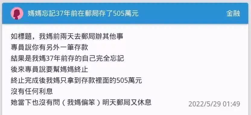 郵局存505萬,天兵放37年才想到領出金額傻眼,急求助這種正常嗎,網頁破盲點:沒錯啊.!