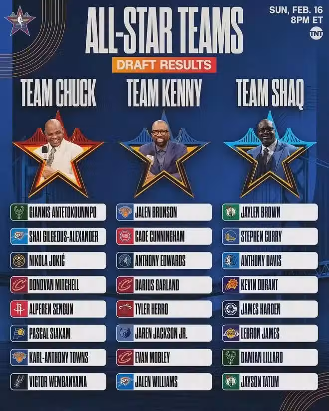 全明星正賽有四支球隊,外一支是新秀賽的冠軍。四支球隊打淘汰賽,包括兩場半決賽和一場決賽,每場都是先超過40分的隊伍獲勝!奧尼爾隊星光熠熠:詹姆斯、庫里、濃眉、塔圖姆、杜蘭特、利拉德、哈登、杰倫-布朗。