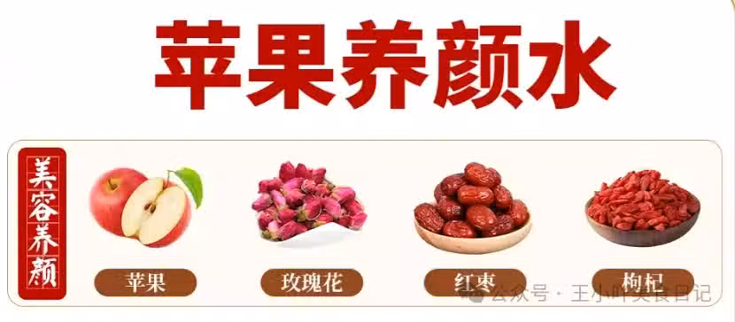 大家好,我是王小吖。蘋果,這一日常水果,不僅口感脆甜,更蘊含著豐富的營養價值和藥用價值。中醫理論認為,蘋果性平,味甘、微酸,入脾、胃經,具有生津止渴、潤肺除煩、健脾益胃、養心益氣等功效。今天,我們就來探討幾種蘋果的神仙搭配,通過簡單的煮水方法,讓這些食材的效用發揮到極致,為身體帶來意想不到的益處。 蘋果養顏水:熬夜族的福音 蘋果:富含維生素C和多種抗氧化物質,能有效抵抗自由基,促進皮膚新陳代謝。 玫瑰花:性微溫,味甘、微苦,歸肝、脾經,有理氣解郁、活血散瘀之效,常用於肝氣鬱結所致的色斑、面色無華。 紅棗:性溫,味甘,歸脾、胃經,能補中益氣,養血安神,改善面色蒼白、乏力等症狀。 枸杞:性平,味甘,歸肝、腎經,滋補肝腎,明目,增強免疫力。