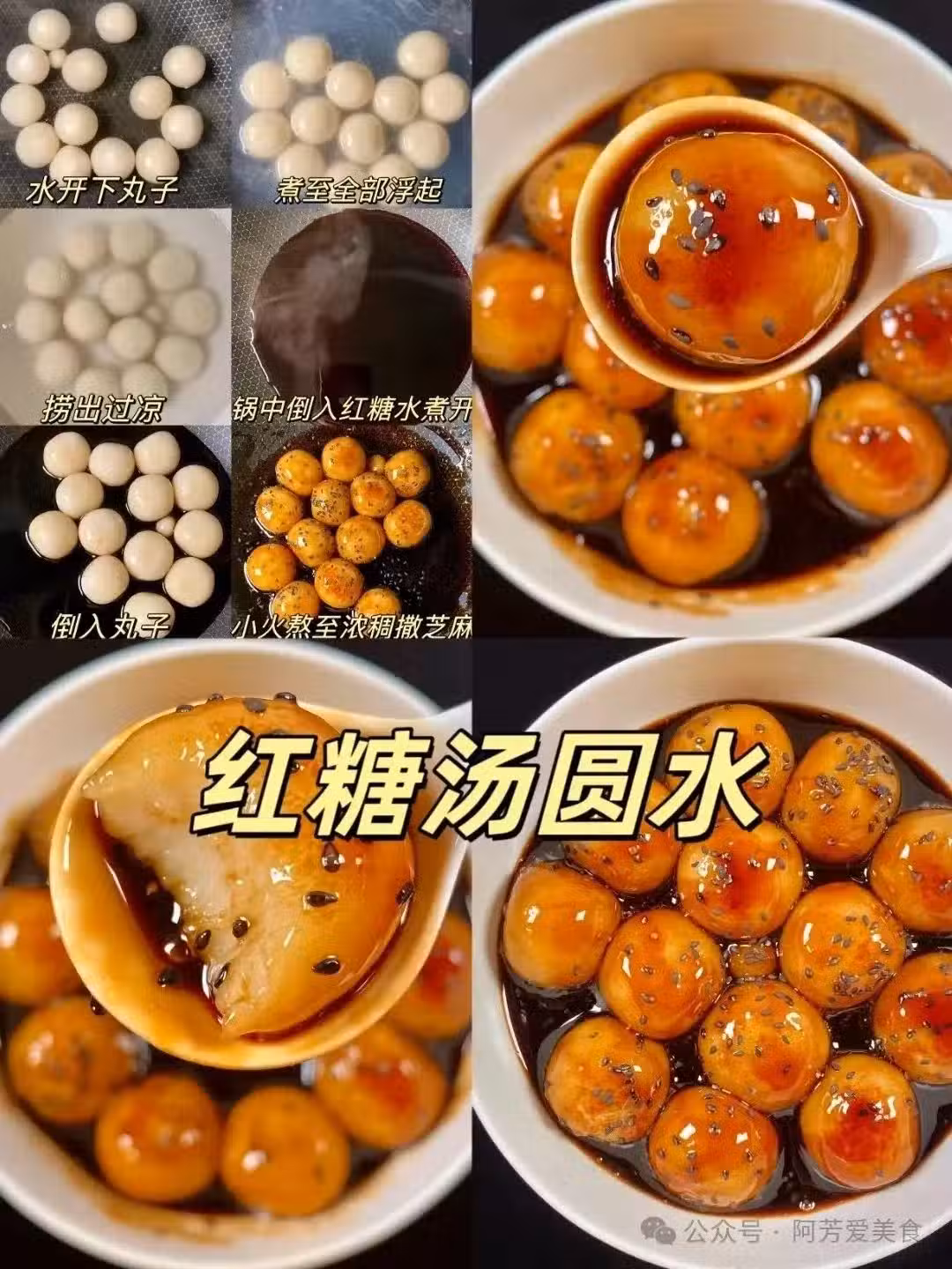 紅糖湯圓水,紅糖的口感帶著一絲甜,但是不會說非常的甜,非常適合女孩子們喝噢。再搭配湯圓,超級的好吃。