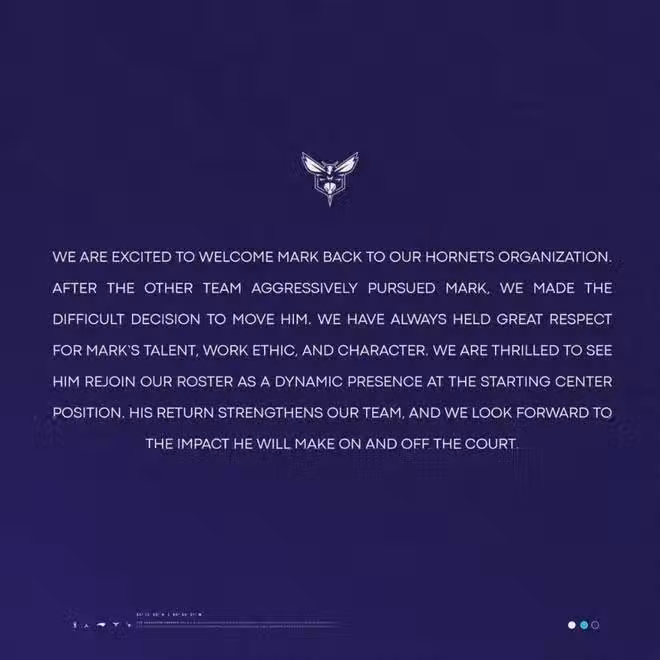 黃蜂官方這樣寫道:「在另外一支球隊(湖人)強烈追求之下,黃蜂做出艱難決定,將馬威交易。我們很高興看到馬威作為首發中鋒,重新回歸我們球隊。」看到黃蜂這段聲明,湖人總裁佩林卡再次重申:是黃蜂主動向湖人兜售馬威。