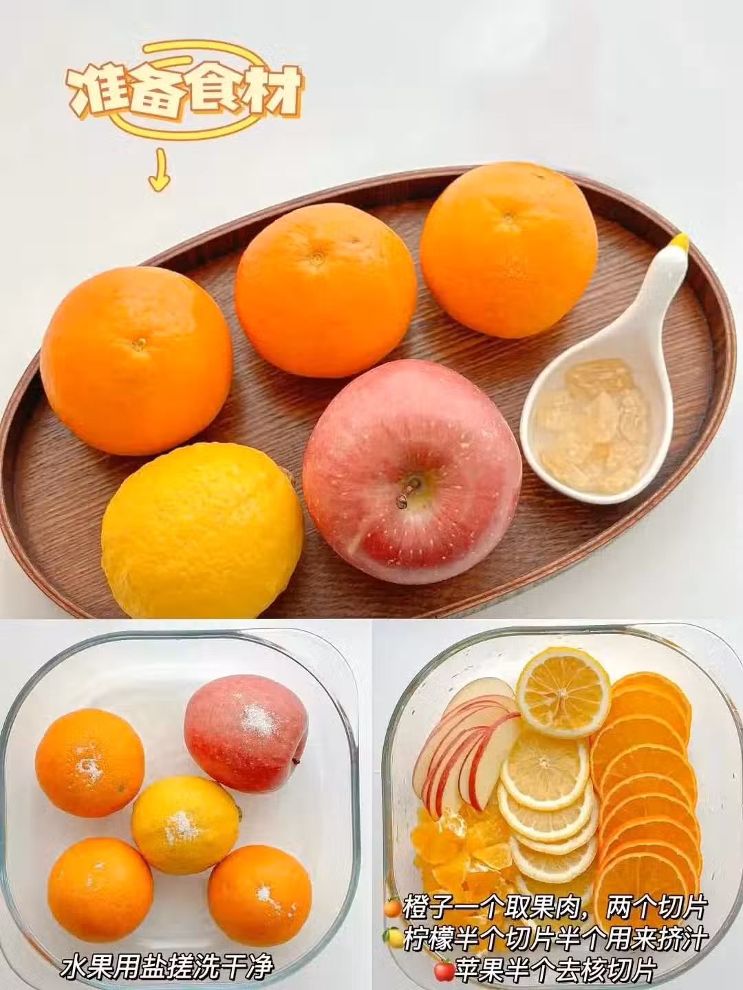 1. 準備食材:將橙子、檸檬和蘋果按照上述要求處理好。