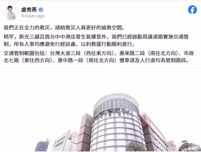 盧秀燕也在臉書發文指出,「我們正在全力的救災,請給救災人員更好的搶救空間。