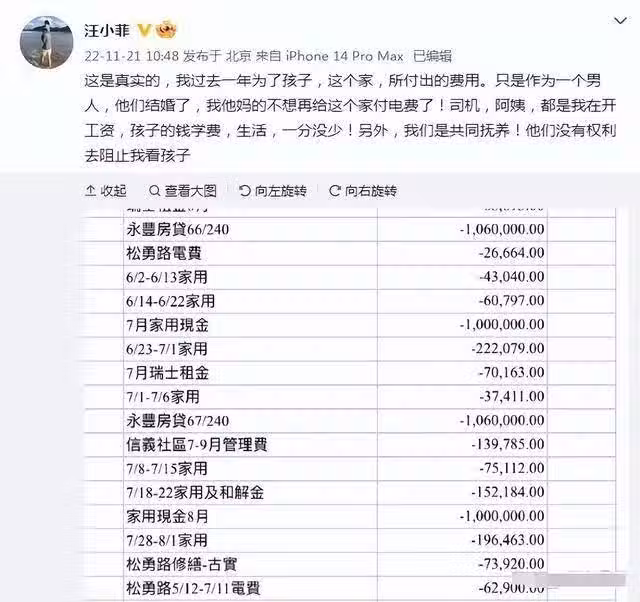 大S與汪離婚之後,按照兩人的協議,汪每個月還得支付撫養費和房貸。