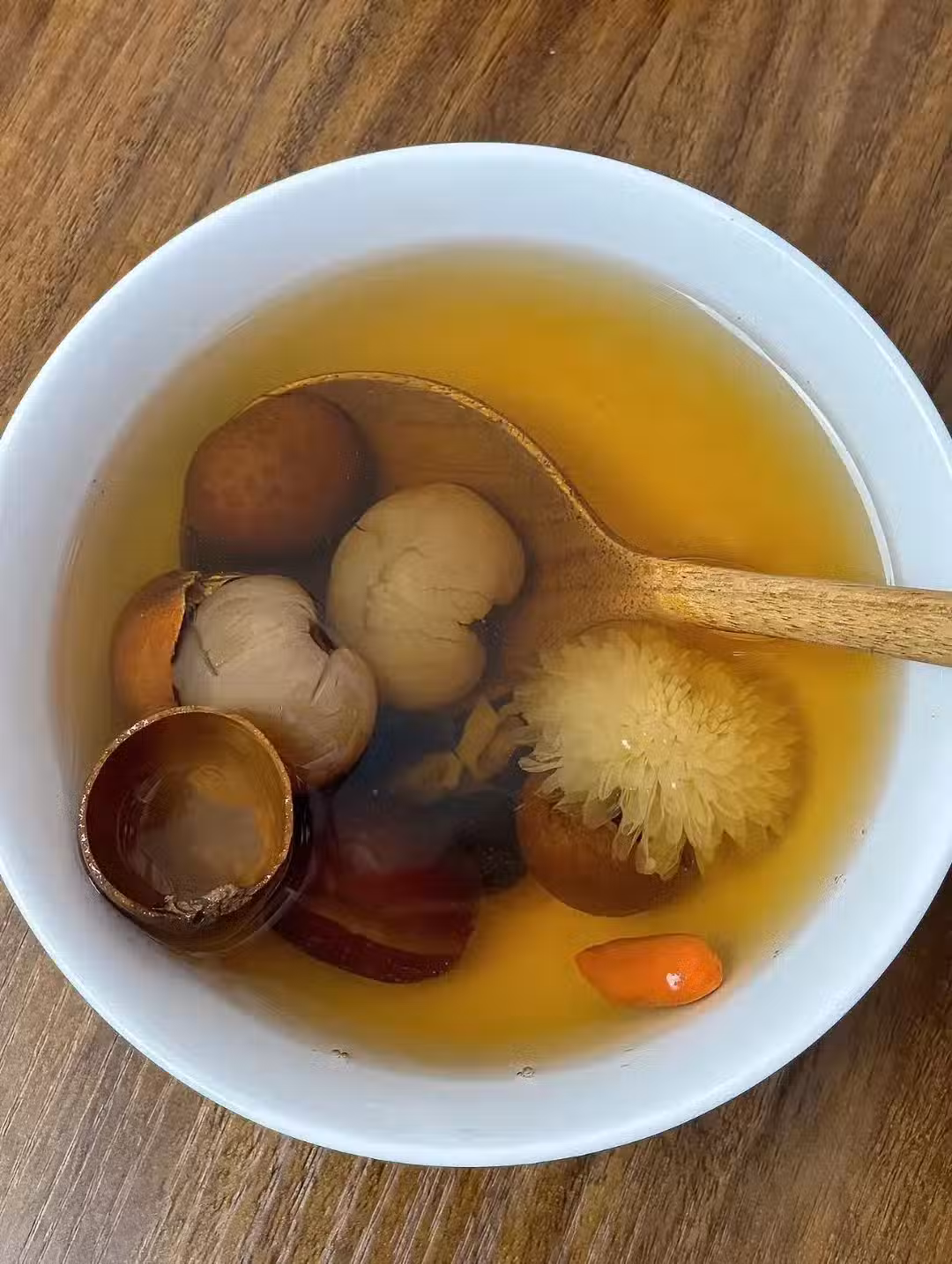 食材:桂圓6個,紅棗4個,枸杞子5克,菊花2朵