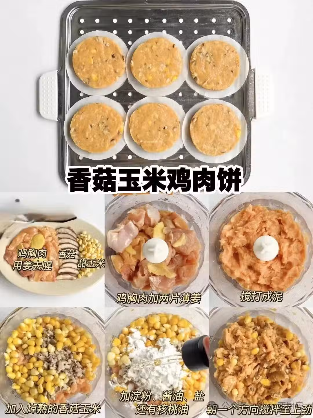 • 將切碎的香菇和甜玉米粒加入到雞肉泥中。• 用筷子或勺子將所有材料攪拌均勻。