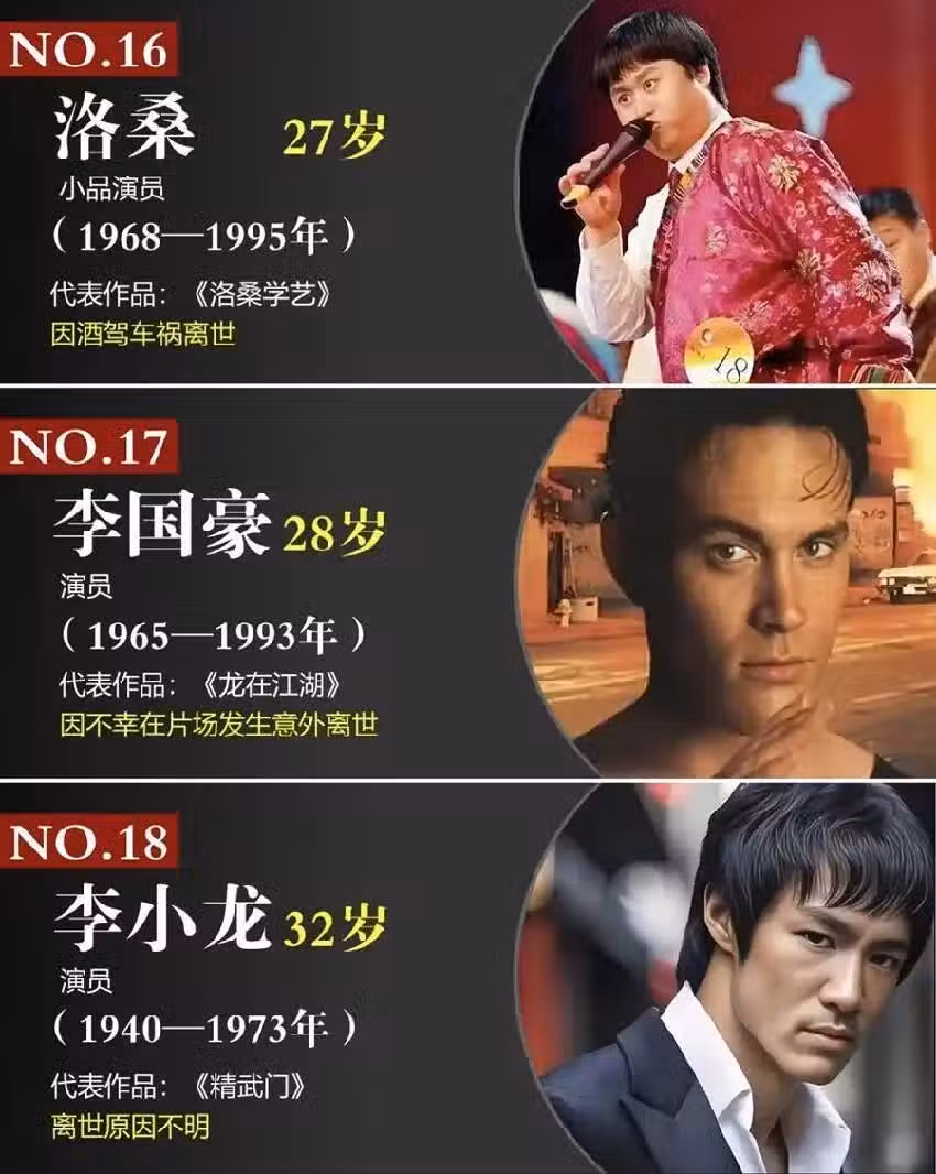 李小龍:32歲演員(1940-1973年)代表作品:《精武門》離世原因不明。