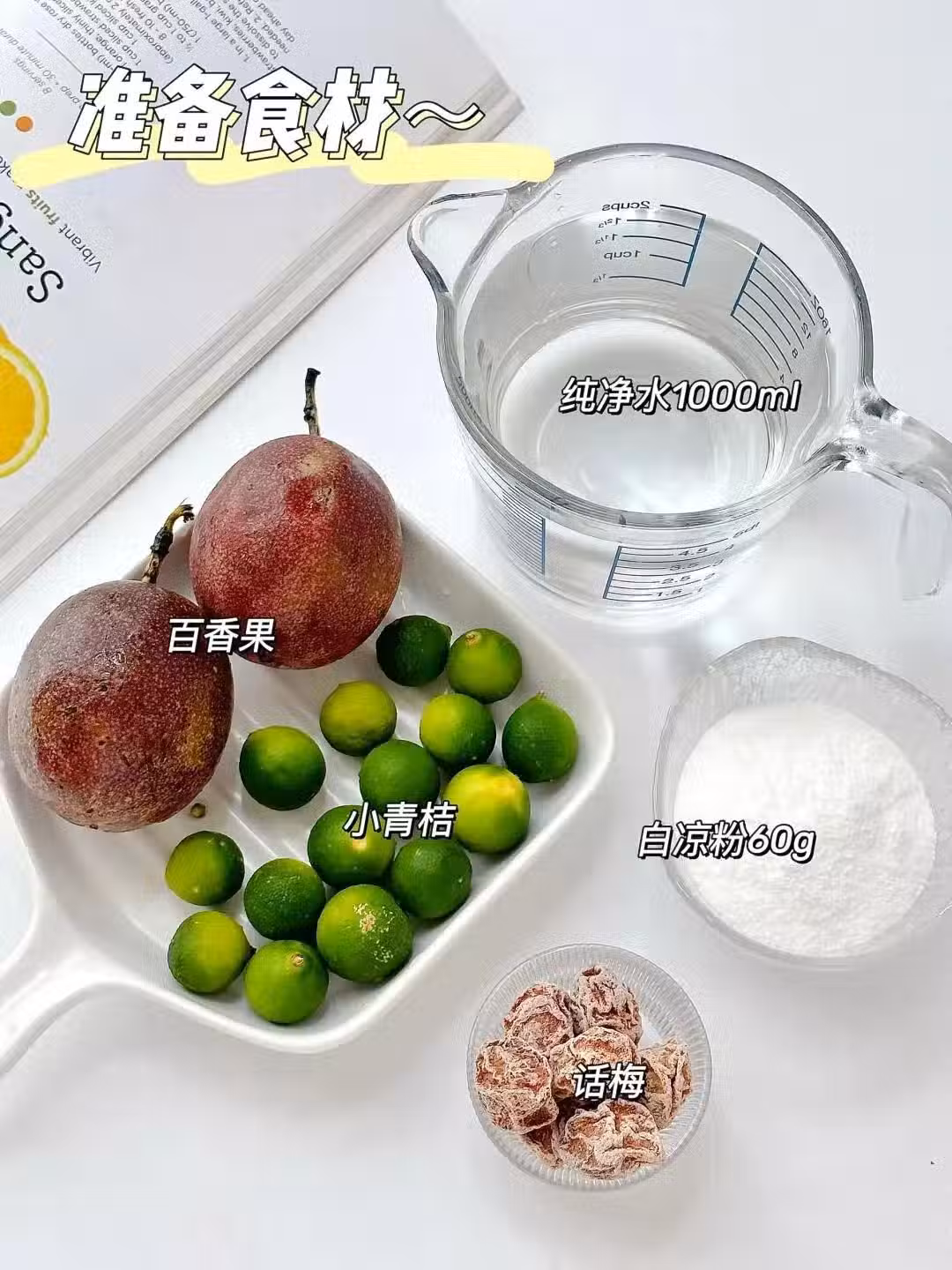 青桔30g,百香果2個,話梅8顆,白涼粉60g,清水1200ml,蜂蜜適量