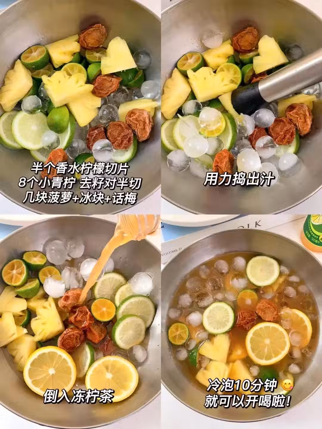 1.檸檬和青桔用鹽水搓洗乾淨,再用小刀切成薄片,菠蘿也去皮,洗凈後切塊