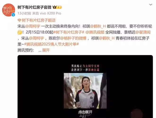 《樹下有片紅房子》講述了醫院家屬院中,景棲遲(翟瀟聞飾)、陳歡爾(楊肸子飾)、宋叢(周柯宇飾)等一眾小夥伴,陪伴對方走過人生關鍵節點的青春故事。