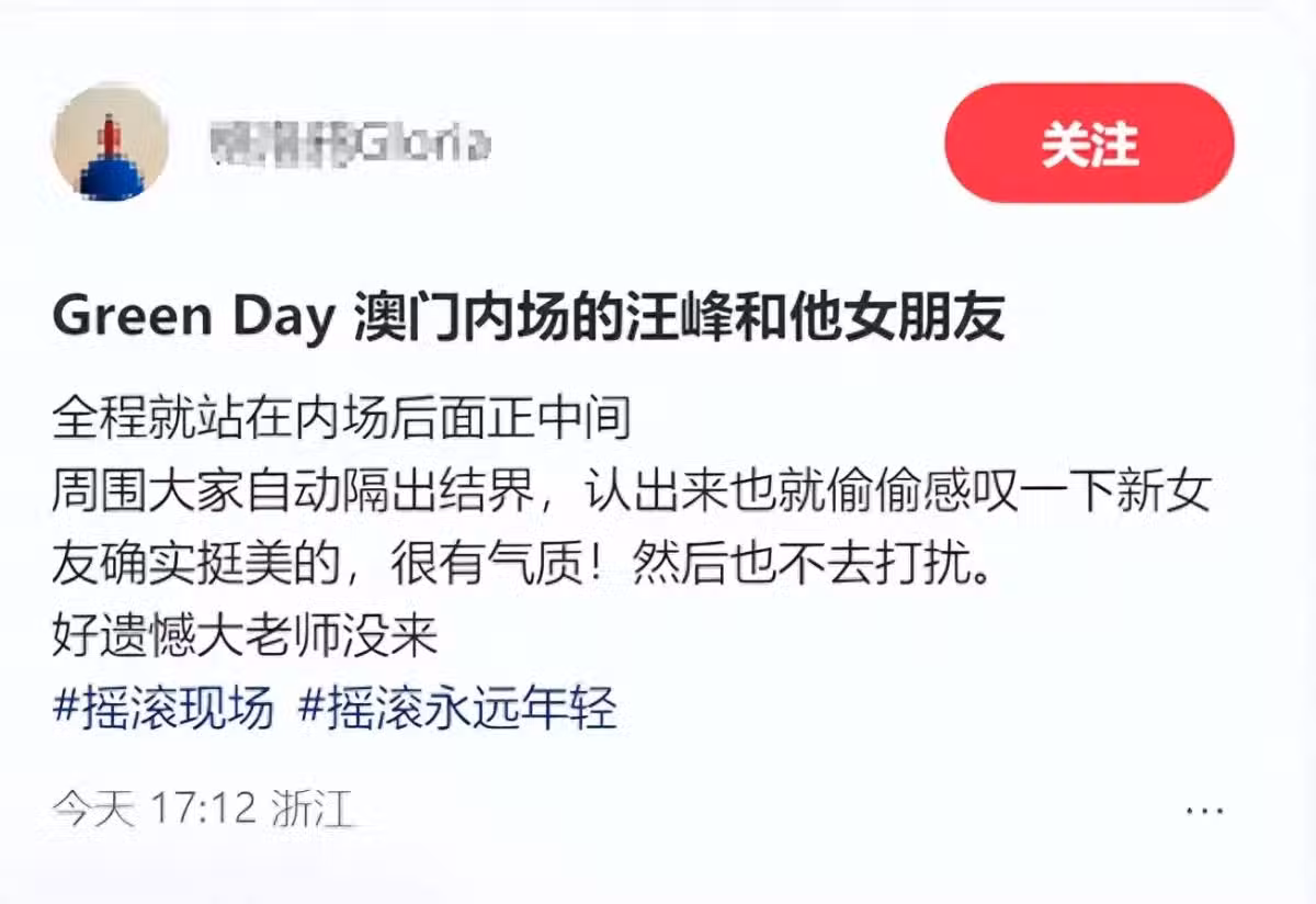 偶遇的網友透露,汪峰和女友全程站在了內場後面正中間,而周圍的人似乎非常有默契,自動隔出了一條結界。另外,森林北本就氣質不凡,儘管戴著口罩,但很容易被人關注。況且,汪峰還把口罩往下移,自然被周圍的觀眾一下認出來了。