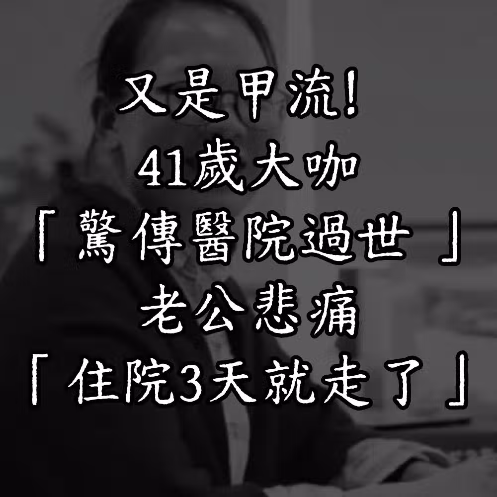 又是甲流!41歲大咖「驚傳醫院過世 」...老公悲痛「住院3天就走了」