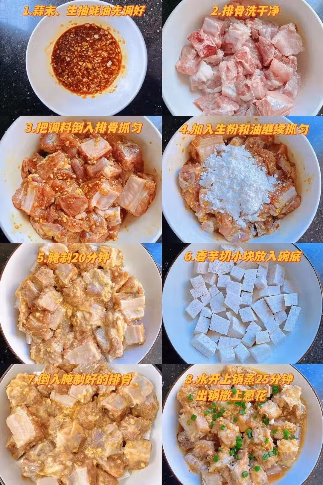 2.香芋切小塊鋪放在碗底,倒入腌制好的排骨,水開上鍋蒸排骨25分鐘,出鍋撒蔥花即可