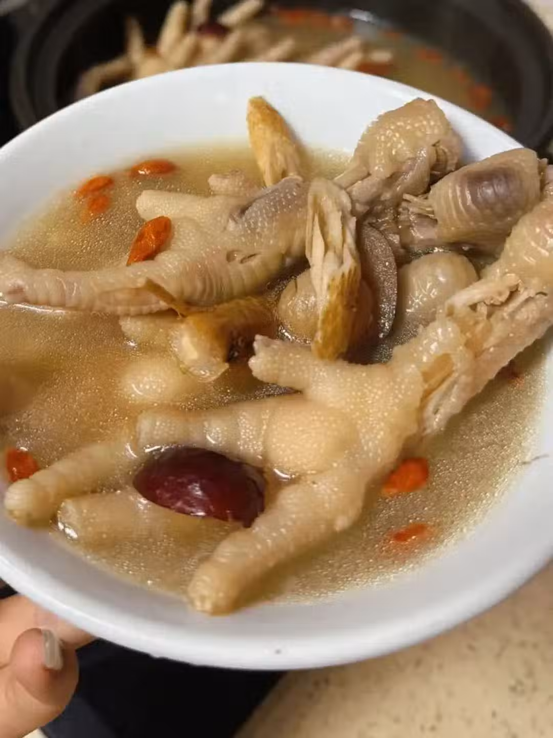 【✅做法】: 1、先把適量雞爪去掉指甲,放入鍋中焯水清洗乾淨,倒入砂鍋中; 2、加入清洗的食材:黃芪、當歸、黨參、桂圓乾、去核紅棗、麥冬,放入鍋中; 3、放入適量的清水大火煮開轉小火燉煮40分鐘;