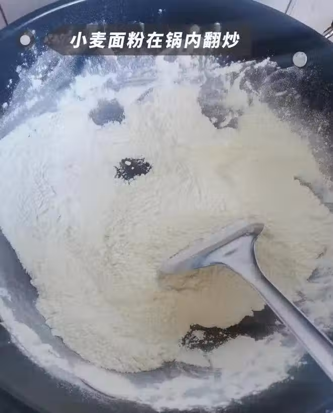 2.接著,開小火,慢慢翻炒,直到麵粉變成微微的黃色,空氣中瀰漫著誘人的小麥焦香。這時候,麵粉里的澱粉已經開始發生變化,溫性逐漸增強。