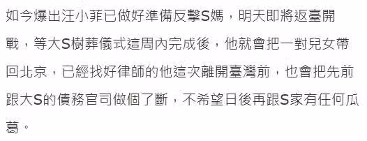 報道稱,汪小菲已經找好律師,會把和大S的債務官司做個了斷,不希望與大S家人有任何瓜葛。