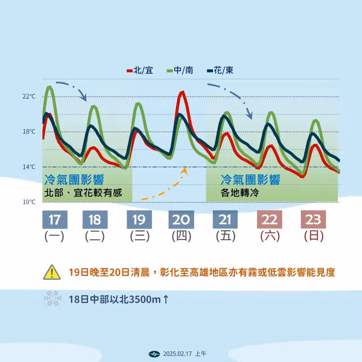 氣象專家指出,本周四入夜後開始變天,北海岸、基隆、大台北東側區域,以及東北角和宜花東地區可能會出現零星降雨。周五則會受到鋒面和大陸冷氣團的雙重影響,降雨範圍將擴大至台中以北地區及宜花地區,中南部和台東山區在午後也可能出現零星雨勢。