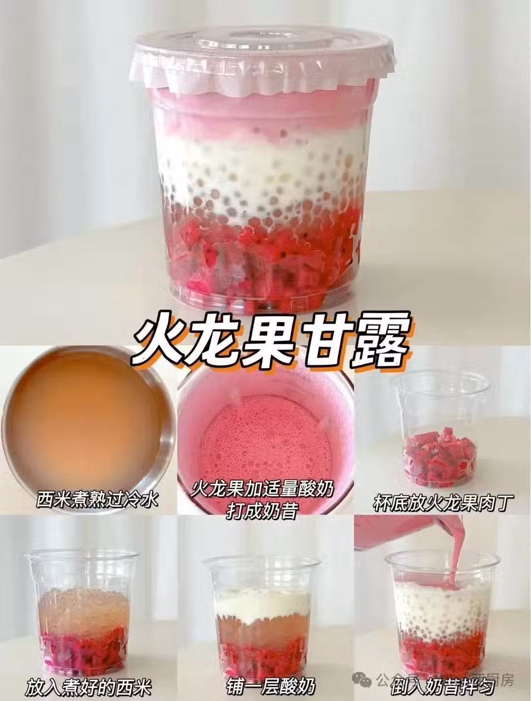 組裝飲品:在杯底放入火龍果丁;放入煮好的西米;鋪一層約50克的酸奶;倒入火龍果奶昔,攪拌均勻即可。