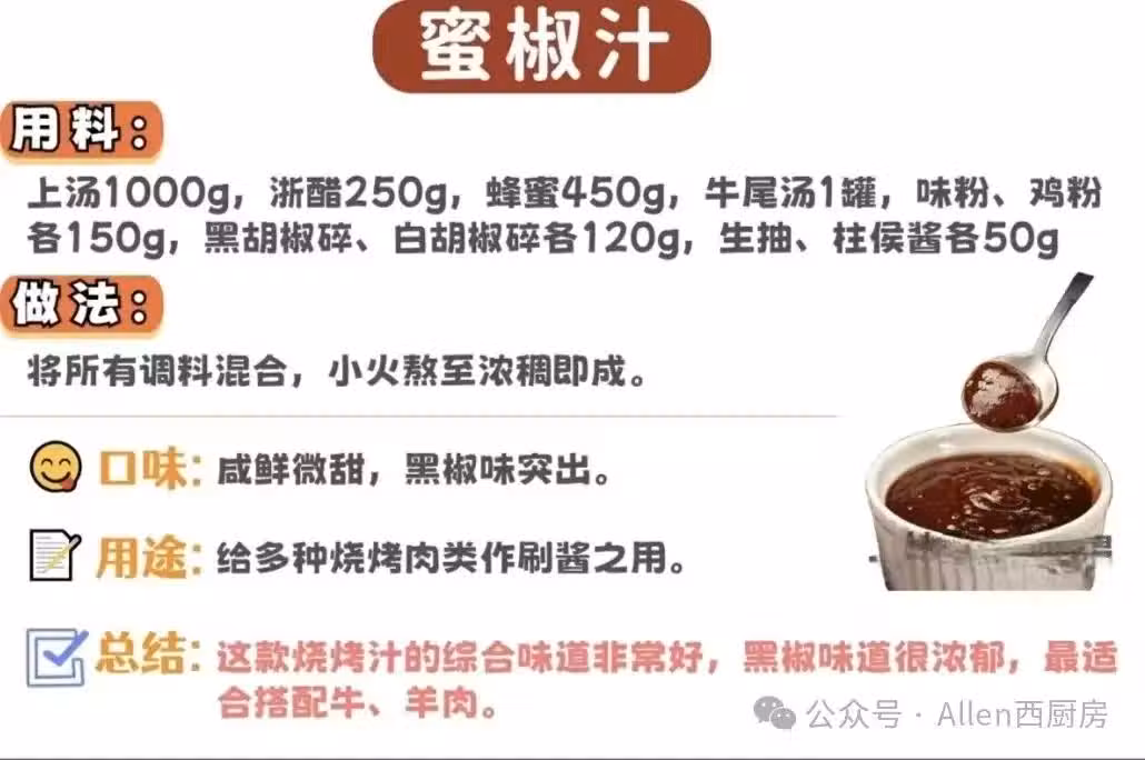 - 用料:上湯1000g、浙醋250g、蜂蜜450g、牛尾湯1罐、味粉150g、雞粉150g、黑胡椒碎120g、白鬍椒碎120g、生抽50g、柱侯醬50g。