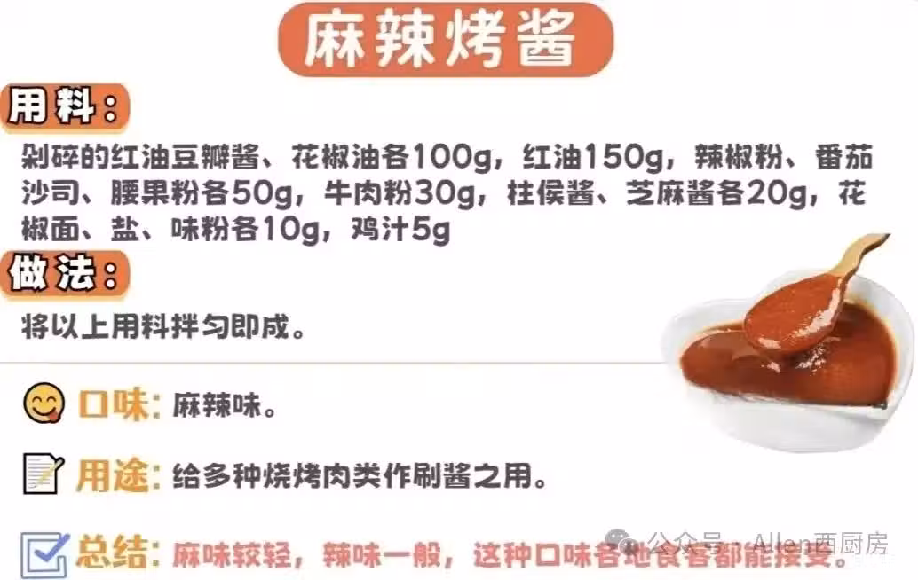 - 用料:剁碎的紅油豆瓣醬100g、花椒油100g、紅油150g、辣椒粉50g、番茄沙司50g、腰果粉50g、牛肉粉30g、柱侯醬20g、芝麻醬20g、花椒麵10g、鹽10g、味粉10g、雞汁5g。