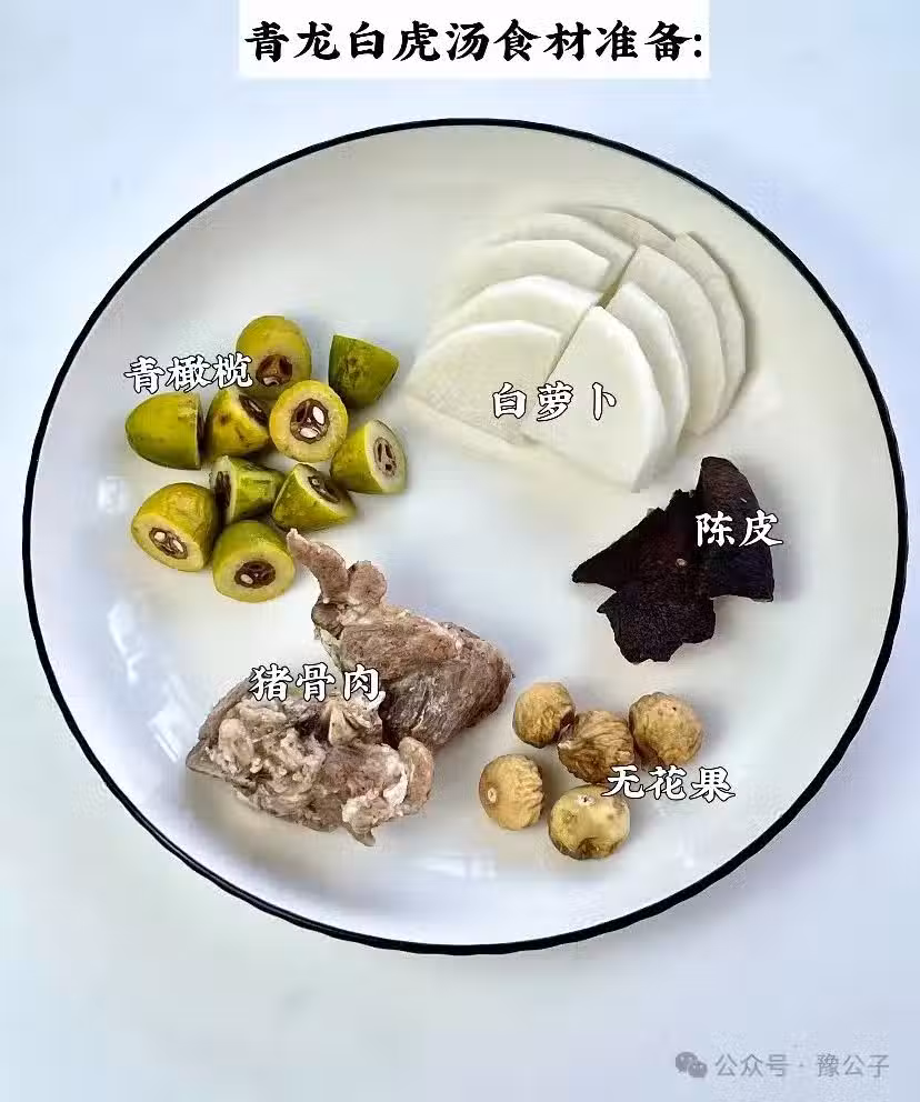 🥣做法: 豬骨洗凈焯水,青橄欖切開,陳皮颳去內囊(防止苦澀)所有食材一併放進燉盅里,加入適量涼白開,隔水燉2.5小時,出鍋按個人喜好調味~ ✔️青龍就是橄欖 白虎就是白蘿蔔 ✔️青橄欖入肺胃經,可以利咽生津,清內熱 ✔️白蘿蔔入肺經,可以理氣化痰,能「清」、能「化」能「通」,既清肺熱、也能化痰生津、還開胃下氣。