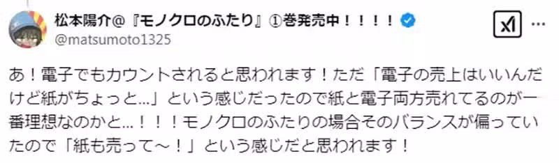 「以我個人來說,不論大家買哪一種單行本,我都抱持著『您願意買我就感激不盡了~~~!!!』的心情。然而基於編輯部的立場,似乎還是會很在意實體書的銷量!!!(我還是真的很感謝購買電子書的大家!!!)」