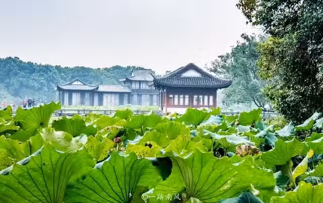 曲院風荷位於杭州西湖的西側,岳飛廟前,連接蘇堤與楊公堤,展現江南園林之美。