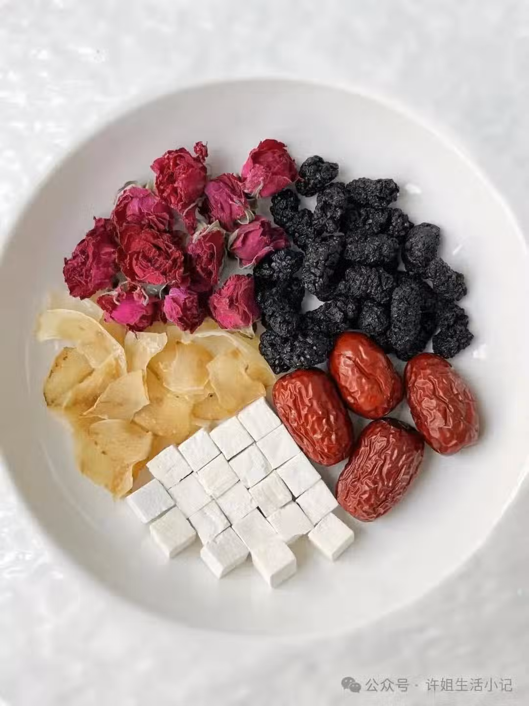 食材:百合6g+紅棗3顆+茯苓6g+玫瑰6g+桑葚3g