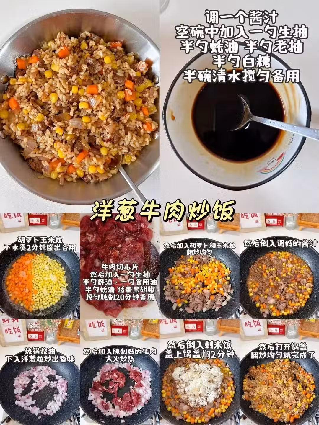 洋蔥絲炒到透明甜軟,牛肉片滋滋冒油,撒點黑胡椒海鹽,米飯倒進去扒拉到粒粒沾滿肉香。建議配罐啤酒,假裝自己在深夜食堂。
