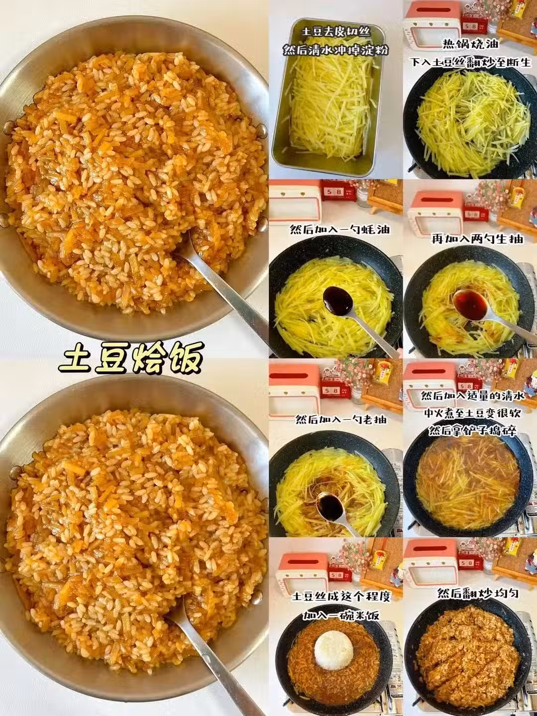 土豆切絲煎到斷生,剩飯懟進去加水燜軟,撒把蔥花攪和成黏糊糊一鍋。碳水疊碳水,香到跺腳!東北老鐵親測:「這玩意兒就著大蒜,我能幹兩盆!」