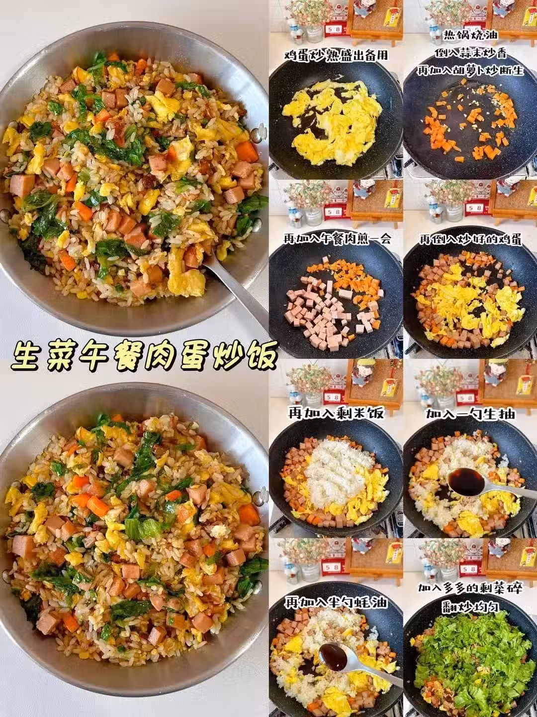 《請回答1988》德善看了都點贊!午餐肉煎到焦香,生菜撕碎最後扔進去翻兩下,脆生生裹著蛋香。記住:一定要用鐵勺子挖著吃,儀式感拉滿!