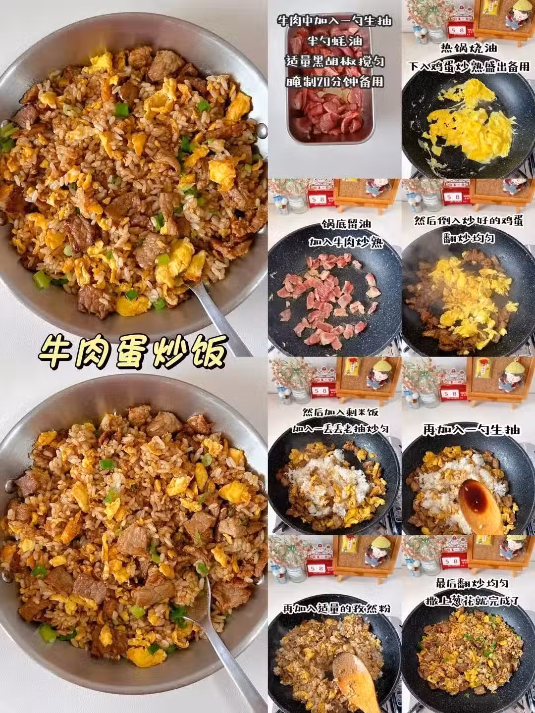 冷知識:牛肉切粒比切片更耐嚼!牛肉粒用生抽澱粉腌10分鐘,猛火快炒鎖住肉汁,蛋液包裹米飯直接上演「黃金甲」。這一口下去,身價瞬間漲十塊。