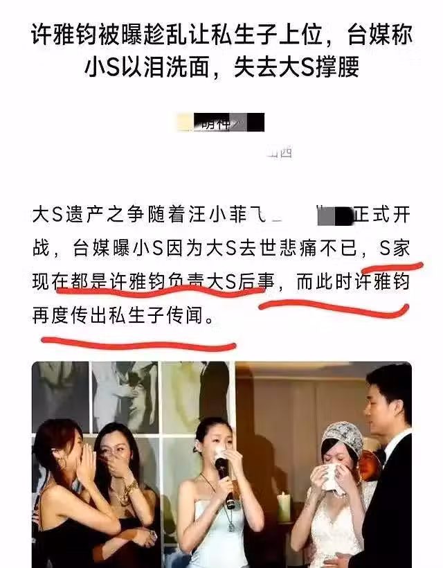 但被台媒追問時全程冷漠臉,只甩出四字真言"謝謝關心"。就連私生子也入了許家族譜,還被曝分走許氏集團0.5%股份;就連大S的樹葬儀式,都傳出許雅鈞挪用公司資金包機的醜聞。要說徐家女人,個個都是"狼人":大S離婚能讓前夫還房貸養現任,S媽手撕張蘭毫不手軟。可偏偏遇到許雅鈞,全家突然變"小白兔":經濟命脈被掐:知情人爆料小S所有收入都上交丈夫,連大S遺產官司都要靠許雅鈞出面;