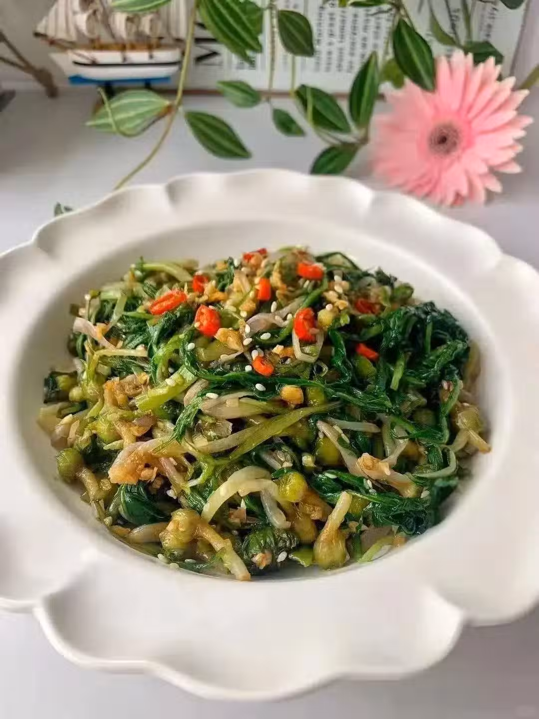 1️⃣ 蒲公英嫩葉鹽水泡10分鐘,沸水+1勺糖焯30秒