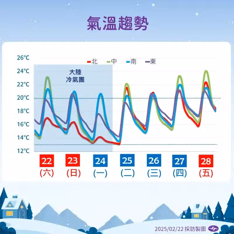 氣象專家吳德榮表示,從周二白天到3月4日,台灣將進入暖氣團範圍,天氣轉為舒適微熱,容易起霧。2月28日至3月4日期間,氣溫更有大幅回暖的趨勢,各地高溫可望突破20度。