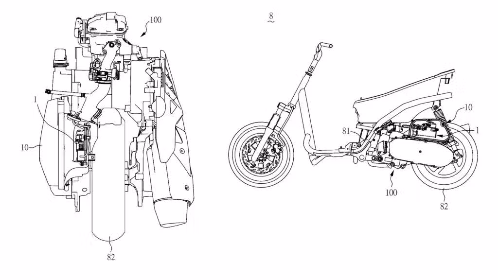 雖然專利公報上的圖片只能看見車架、輪胎、避震器、排氣管與空濾盒的外觀模樣,但整體樣式與Jet SL+非常相似,顯見這個所謂的「搖擺式引擎」是用在Jet SL+。而這項專利的亮點,似乎就是在空濾盒內的設計,顯然就是DRGBT的全域可變進氣系統Hyper-SVIS,能夠偵測ECU的轉速、油門開度訊號,透過電磁閥切換空濾盒中的可動式進氣管,讓低速與高速有不同的進氣模式,兼顧低速省油高扭力、高速性能最佳化的功能。