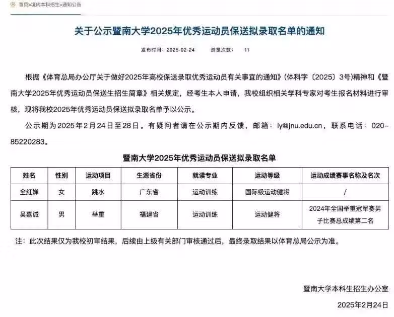 要說暨南大學這個專業可不得了,簡直就是體育明星的搖籃!之前跳水隊的謝思埸、陳艾森都在這兒讀過書,連"亞洲飛人"蘇炳添都在這裡當教授。全妹子來了之後,估計訓練館要成追星現場了——不過追的可是真本事!