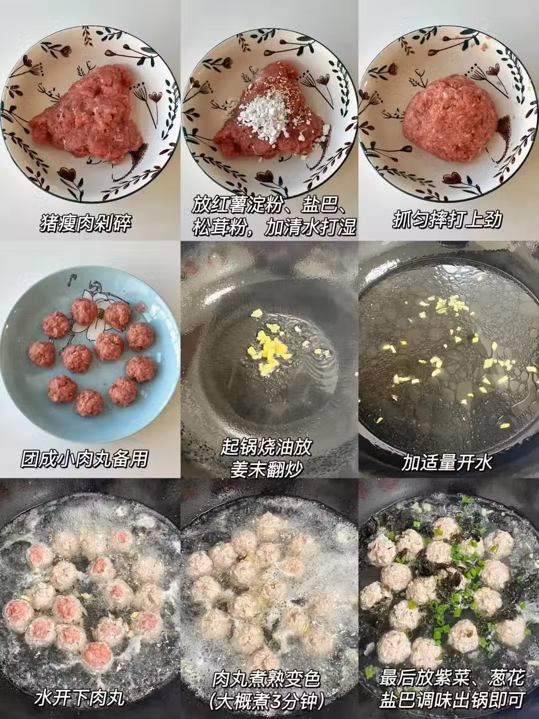 【食材】:豬瘦肉、紅薯澱粉、鹽巴、松茸粉、薑末、紫菜、蔥花