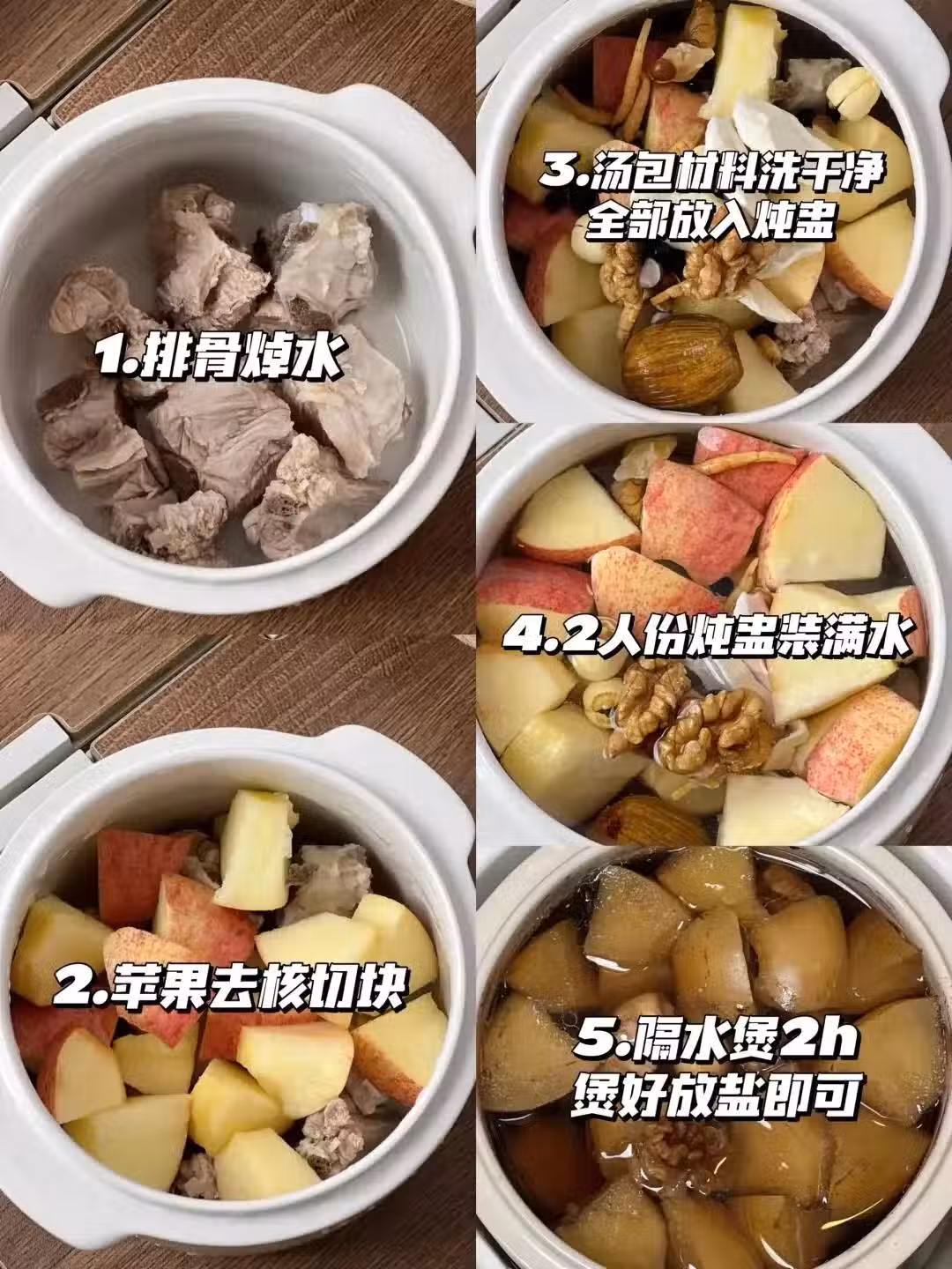 4. 燉盅裝滿水(2人份),加入排骨、蘋果和核桃。