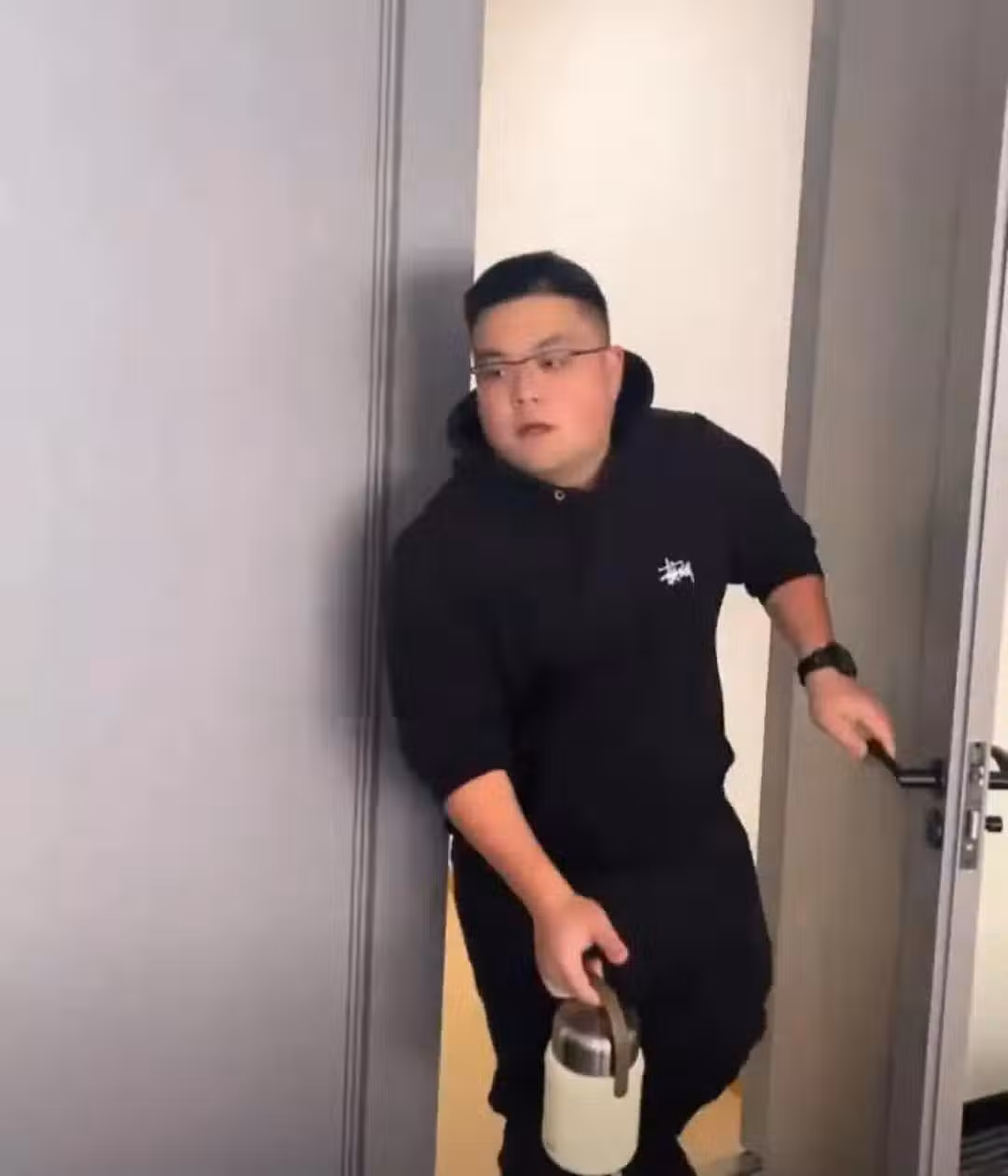 24歲的呂善揚見著寸頭,穿著一身黑色衣服,戴著黑框眼鏡。身高不如爸爸,而且身材肥胖!