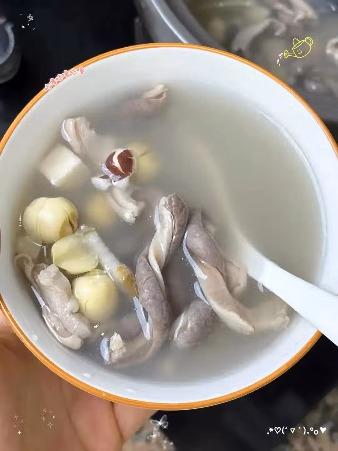 4. 處理好的豬肚片、山藥、芡實、蓮子、茯苓、薑片和磨碎的白鬍椒一起放入煲湯鍋中,加入適量清水,。