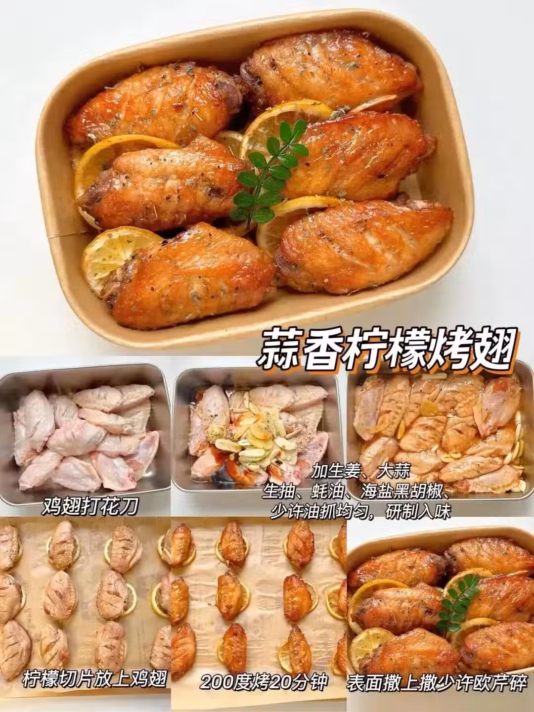雞翅劃刀加蒜末,墊檸檬片,丟進空氣炸鍋180度15分鐘,出鍋撒點歐芹碎。
