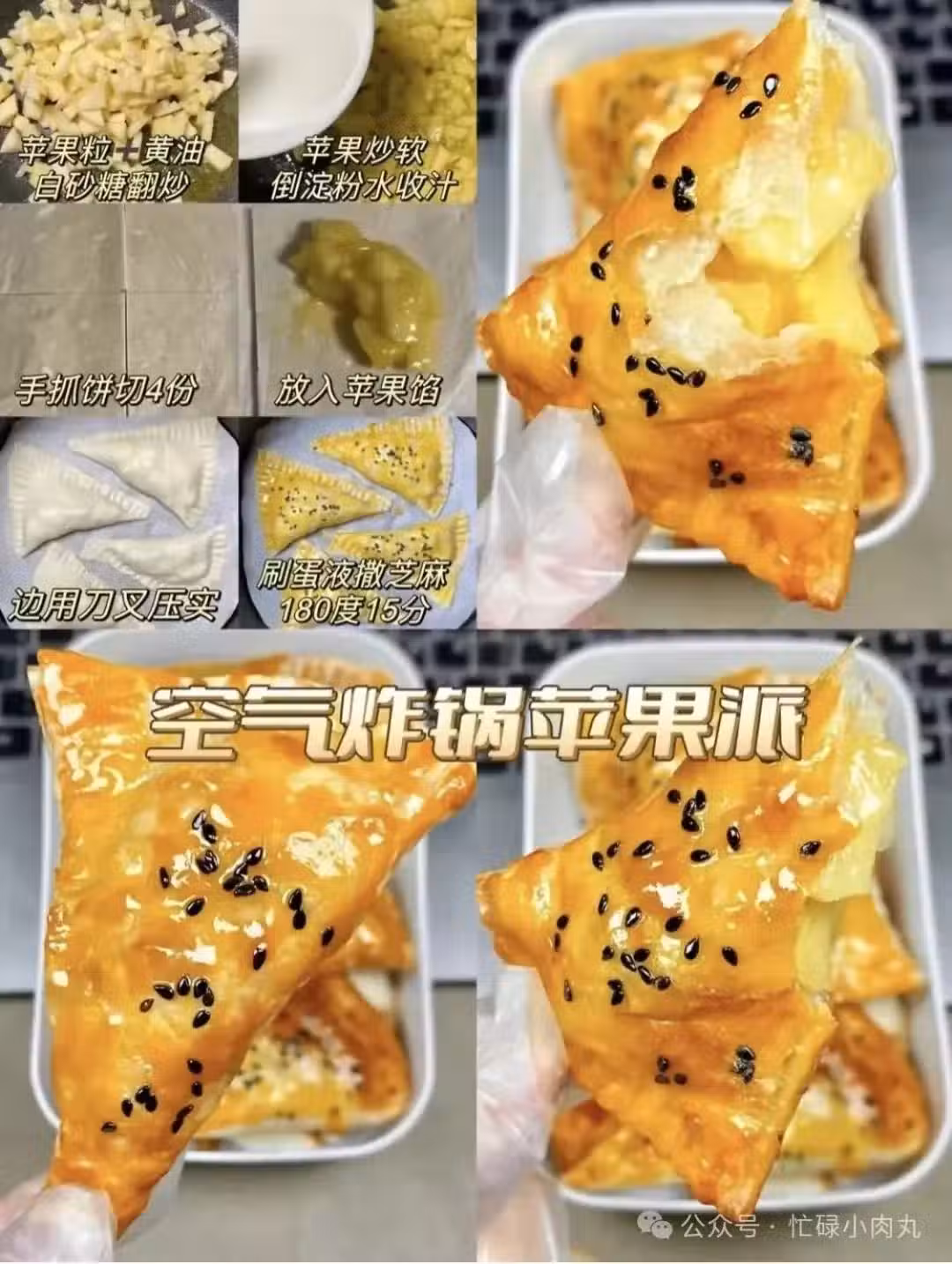 5⃣️饞小零食了?試試空氣炸鍋火腿酥! 在手抓餅上撒上燒烤料和蔥花,捲起切段後放上火腿腸,按壓固定 。刷上蛋黃液,擠上番茄醬和沙拉醬,放入空氣炸鍋170度烤12分鐘,中途翻面。外皮酥脆掉渣,內有火腿咸香,一口一個超滿足,好吃到停不下來!