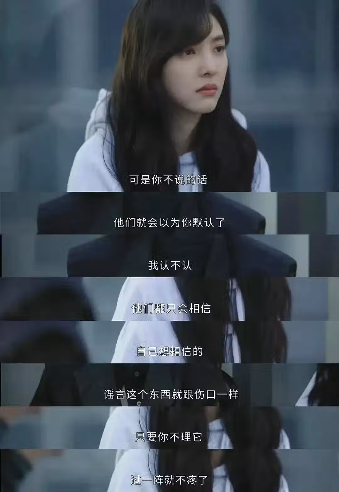 在電視台工作被男同事性騷擾,被造謠,她採取不理會的處理方式。 "造謠這個東西就跟傷口一樣,只要你不理它,過一陣就不會疼了。」很難想到這是一個女記者說的話。