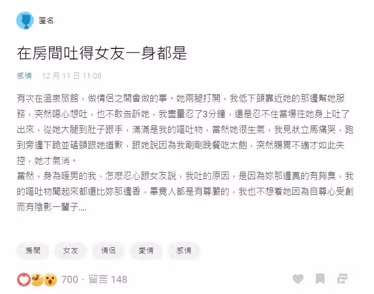 用嘴幫女友服務「臭到受不了」!男友盡力忍3分鐘「暴吐她身上」卻不敢說 ……