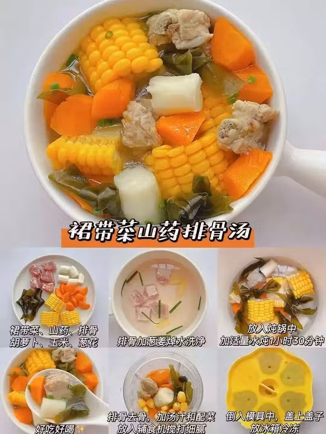排骨加蔥姜焯水洗凈,與裙帶菜、山藥、胡蘿蔔、玉米一起放入燉鍋。