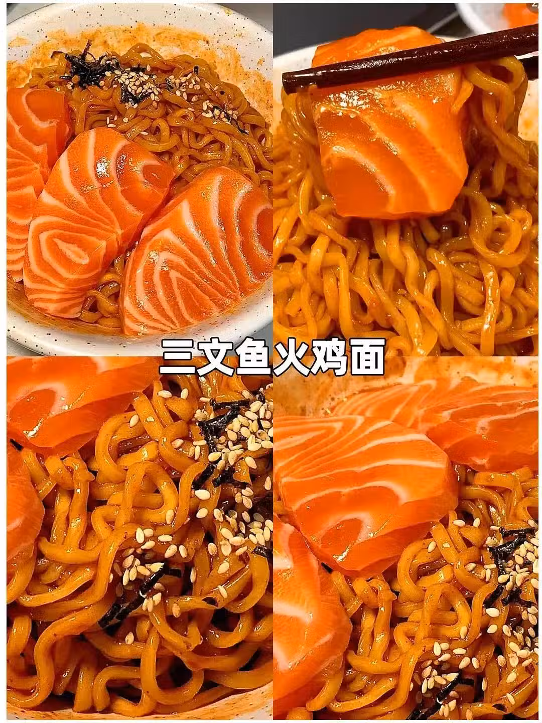 靈感來源:壽司店刺身邊角料的逆襲。 做法:火雞面煮好拌醬,鋪上新鮮三文魚片,擠檸檬汁撒海苔碎。 口感:冰涼肥美的三文魚中和辣勁,辣醬里混著魚油的鮮甜,吃完只想喊「斯國一內~」