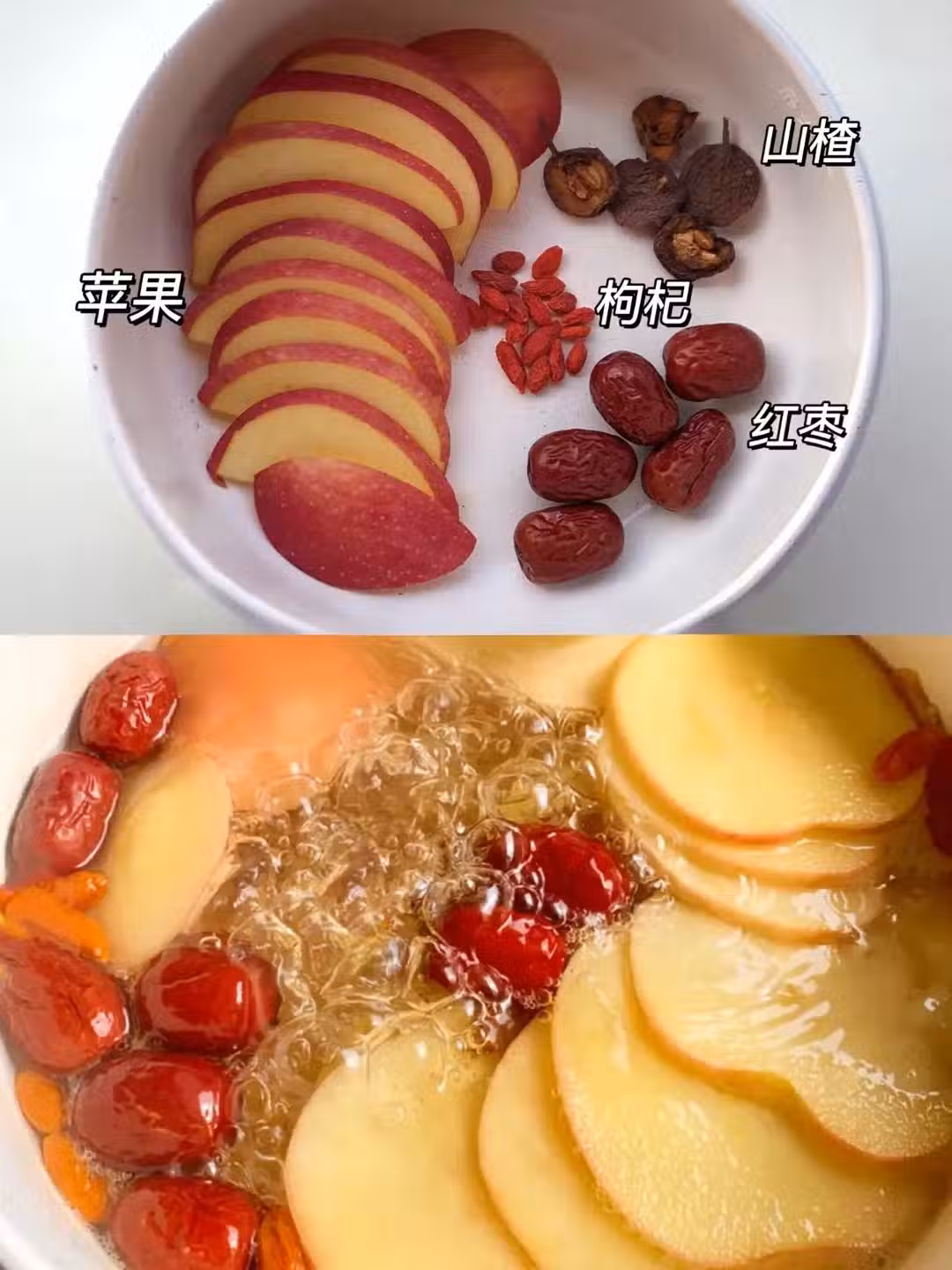 春季氣溫回升,不少人出現皮膚乾燥、喉嚨干癢、易疲勞等問題。比起盲目補水,用蘋果煮水喝對身體更好。 蘋果富含果膠和維生素,但生吃脾胃寒涼者容易刺激腸胃,煮水後性質溫和,更易吸收,搭配不同食材能兼顧潤燥、補氣血、助消化等功效。 今天美美跟大家分享6種蘋果水配方,搭配紅棗、黃芪等常見滋補食材,既能提升口感,又能補充營養,適合全家人日常飲用。 一、蘋果紅棗山楂水 山楂助消化,紅棗補氣血,適合臉色發黃、飯後腹脹的人群。 食材:蘋果半個(帶皮切塊)、紅棗5顆(去核)、干山楂片8克、枸杞 做法:所有食材加1000毫升清水,大火煮開後轉小火20分鐘 飲用建議:飯後1小時飲用,每周3-4次 二、蘋果百合玫瑰水 百合潤肺,玫瑰疏肝,緩解春季失眠、咽喉干痛 食材:蘋果半個(帶皮切片)、百合50克、干玫瑰花5朵、桑葚少許、茯苓少許、紅棗5顆 做法:蘋果、百合、桑葚、茯苓、紅棗煮15分鐘,關火後放入玫瑰花燜3分鐘 飲用建議:下午或睡前2小時飲用