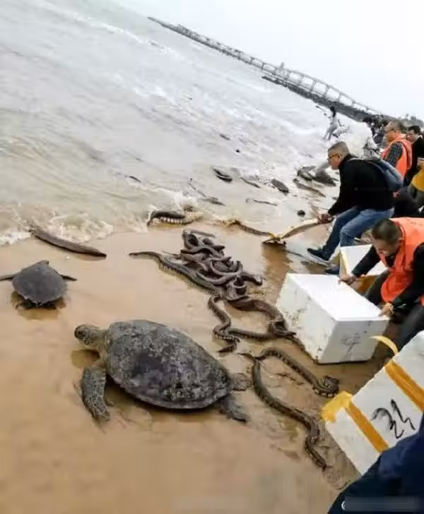 一名和尚竟帶領信徒將一條巨大的「蟒蛇」放生到大海中,以為自己做了一件功德無量的善事。