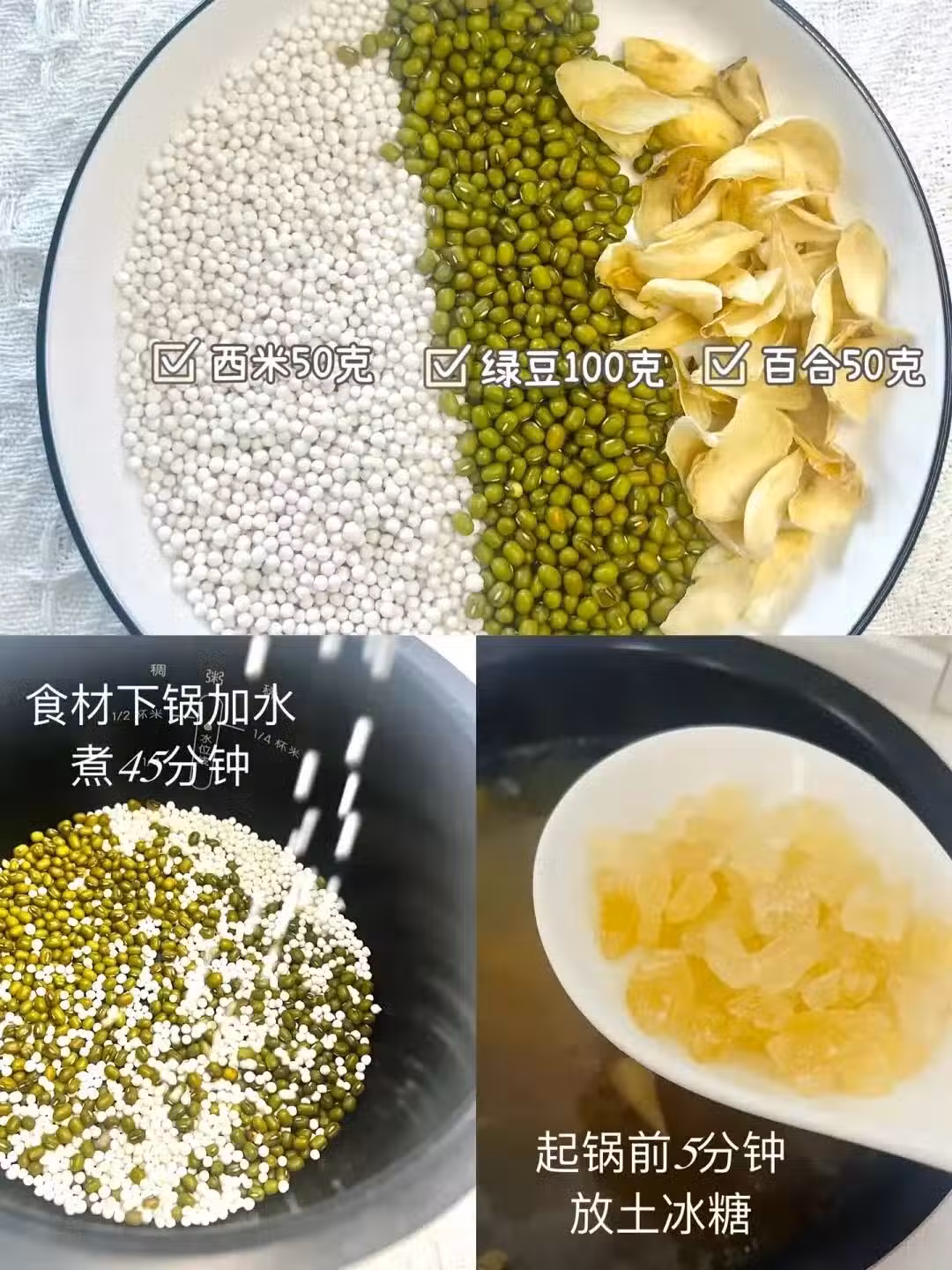 綠豆、百合先浸泡1小時,再和西米洗凈入鍋,煲45分鐘,起鍋前把冰糖倒入,一碗軟糯清爽的綠豆百合西米露就好啦~